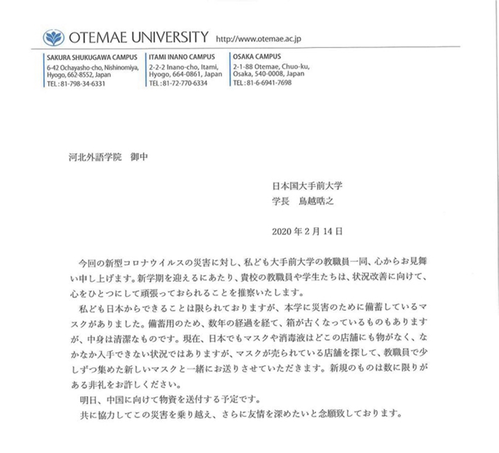 2020年2月,在疫情期间,日本大手前大学向河北外国语学院师生捐赠口罩,全力支持河外师生抗击疫情。