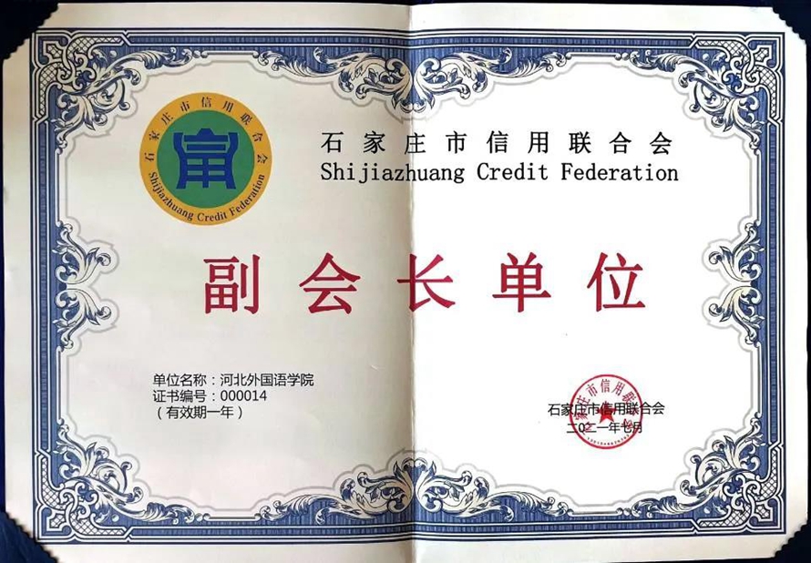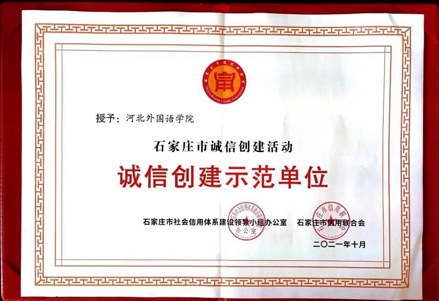 河北外国语学院在石家庄市范围内依法注册,持续经营三年以上的企业,符合遵守国家和本市法律、法规,依法诚信经营,生产经营状况良好;注重自身诚信建设,模范遵守职业道德和行业准则,近三年企业无严重失信行为记录,经专家评审、社会公示、审定批准,市诚信企业创建推进小组综合各方面审核意见和公示情况,确定并公布年度诚信创建企业名单,河北外国语学院被授予诚信创建示范单位,也被授予石家庄市信用联合会副会长单位。