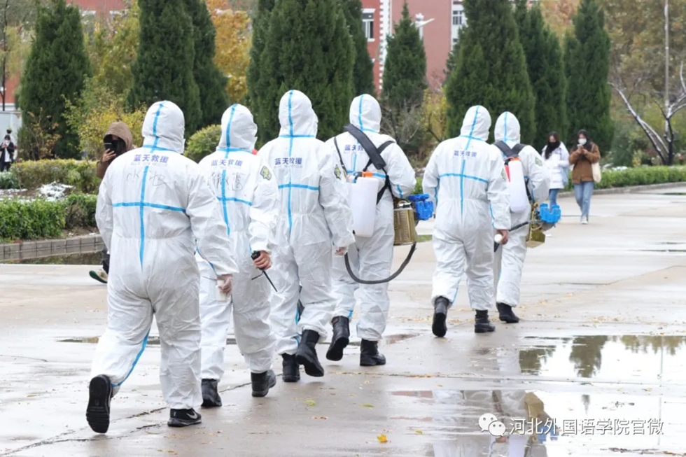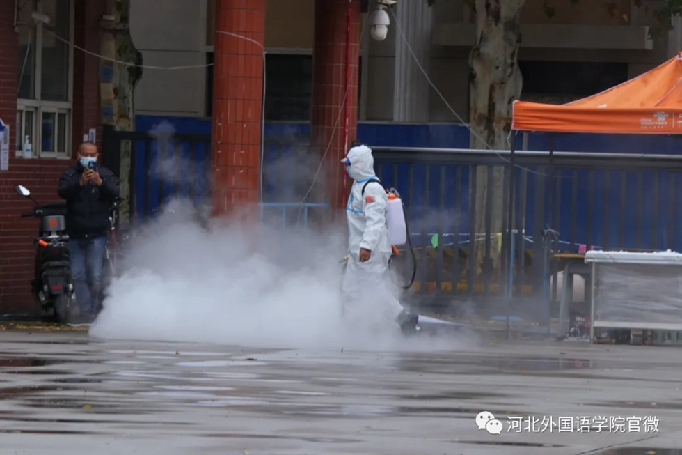 11月7日河北外国语学院迎来了第一场初雪,天冷情不冷。赵书康同学联系到消毒工作人员为河外校园进行义务消杀工作,雪花纷飞,气温骤降,但这个冬天不再寒冷。