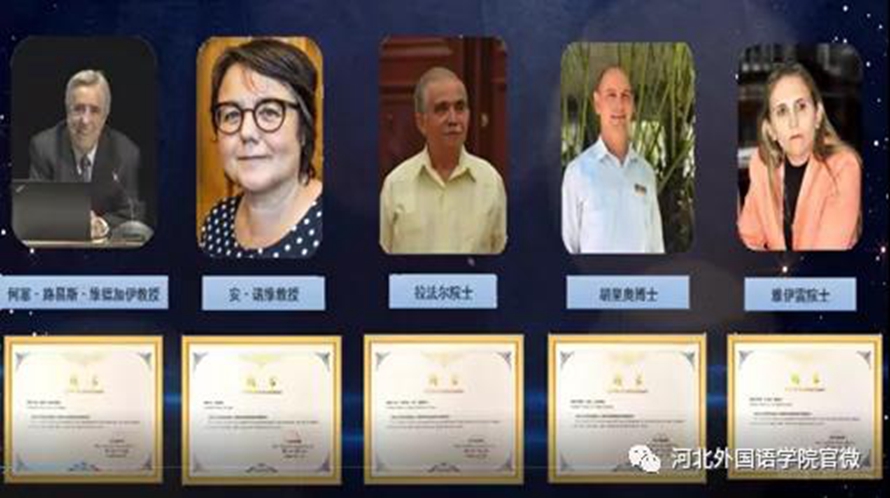 河北外国语学院校长外事助理、副校长杨振博士用汉语、西班牙语、英语等三个语种宣读《关于聘任古巴、西班牙、比利时等5位专家为河北省国际人工智能研究院“特聘研究员”的决定》:为推进建设现代化、国际化、美丽省会石家庄,推动中外“AI+”技术交流与项目合作,助力石家庄国际人工智能 “数、链、云、物、智”5大方向的人才引进、科研、项目、技术等方面的落地应用和成果转化,聘任西班牙格拉纳达大学何塞·路易斯·维德加伊教授、比利时布鲁塞尔自由大学安·诺维教授、古巴拉法尔·埃斯特班·贝洛·佩雷斯院士、古巴雅伊雷·卡巴耶罗·墨塔院士、古巴胡里奥·马德拉·吉达纳教授五位专家为河北省国际人工智能研究院“特聘研究员”。
