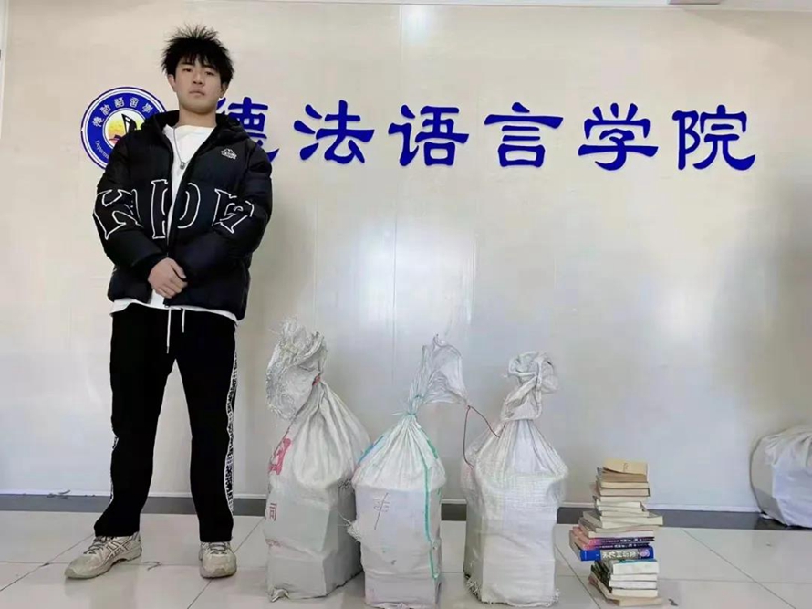 河北外国语学院德法语言学院20法本一班韩思瞳、20法本6班林骞两名同学向学校捐赠400本书籍。