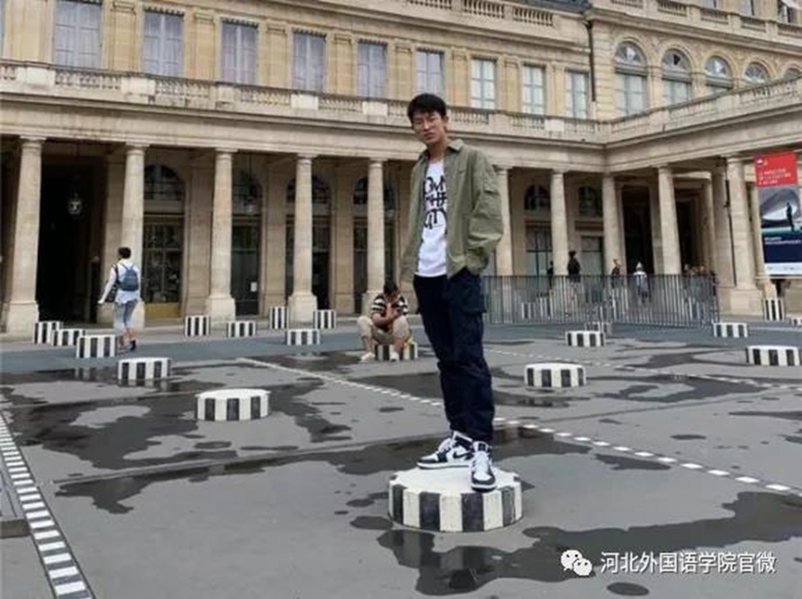 赵昕遥同学认为学习一门语言,语言环境是非常重要的。于是在2019年7月,他报名参加了河北外国语学院与巴黎高等计算机学院的合作游学项目,到法国巴黎游学一个月。为了听懂当地人说话,赵昕遥曾坐在地铁站一下午,通过一遍遍观察车站里人们的动向判断法语意思。游学一个月,他的法语口语能力有了显著提高。