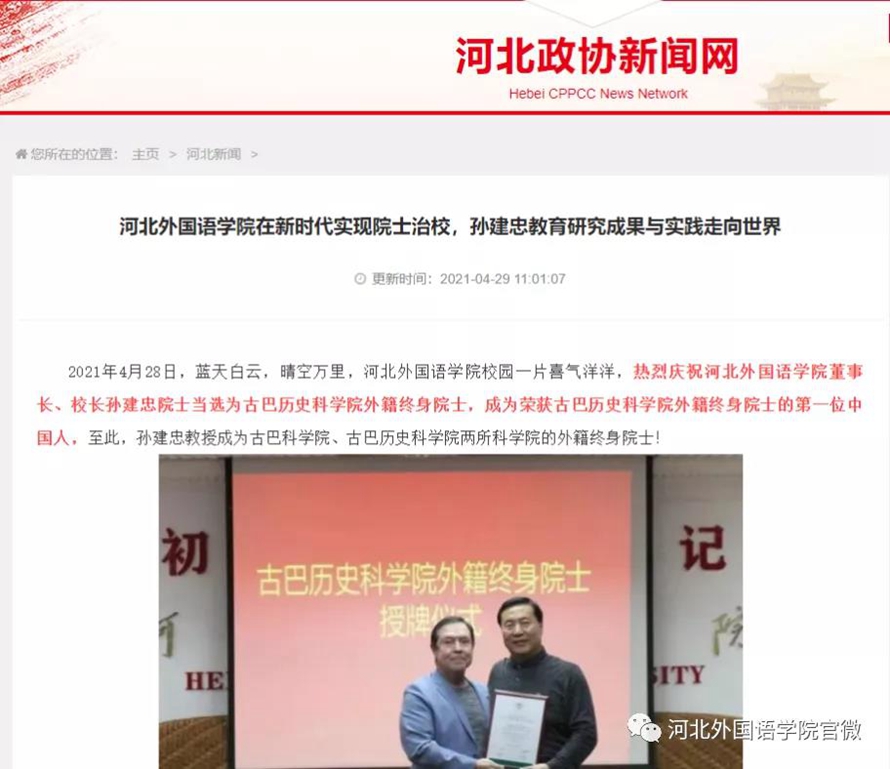 河北外国语学院董事长、校长孙建忠院士当选为古巴历史科学院外籍终身院士,成为荣获古巴历史科学院外籍终身院士的第一位中国人,河北外国语学院在新时代实现院士治校,孙建忠教育研究成果与实践走向世界。