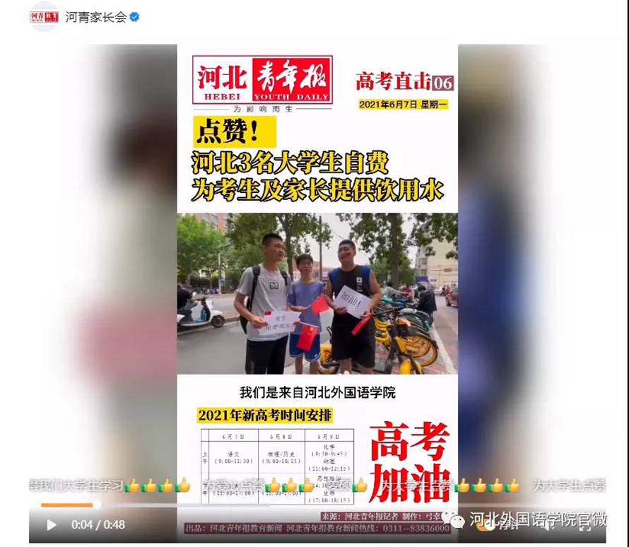 河青家长会视频号报道河外学子自费为高考考生及家长提供饮用水