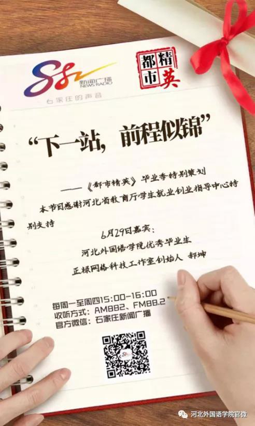 石家庄新闻广播《都市精英》报道河北外国语学院西意葡语言学院毕业生郝坤的创业之路。