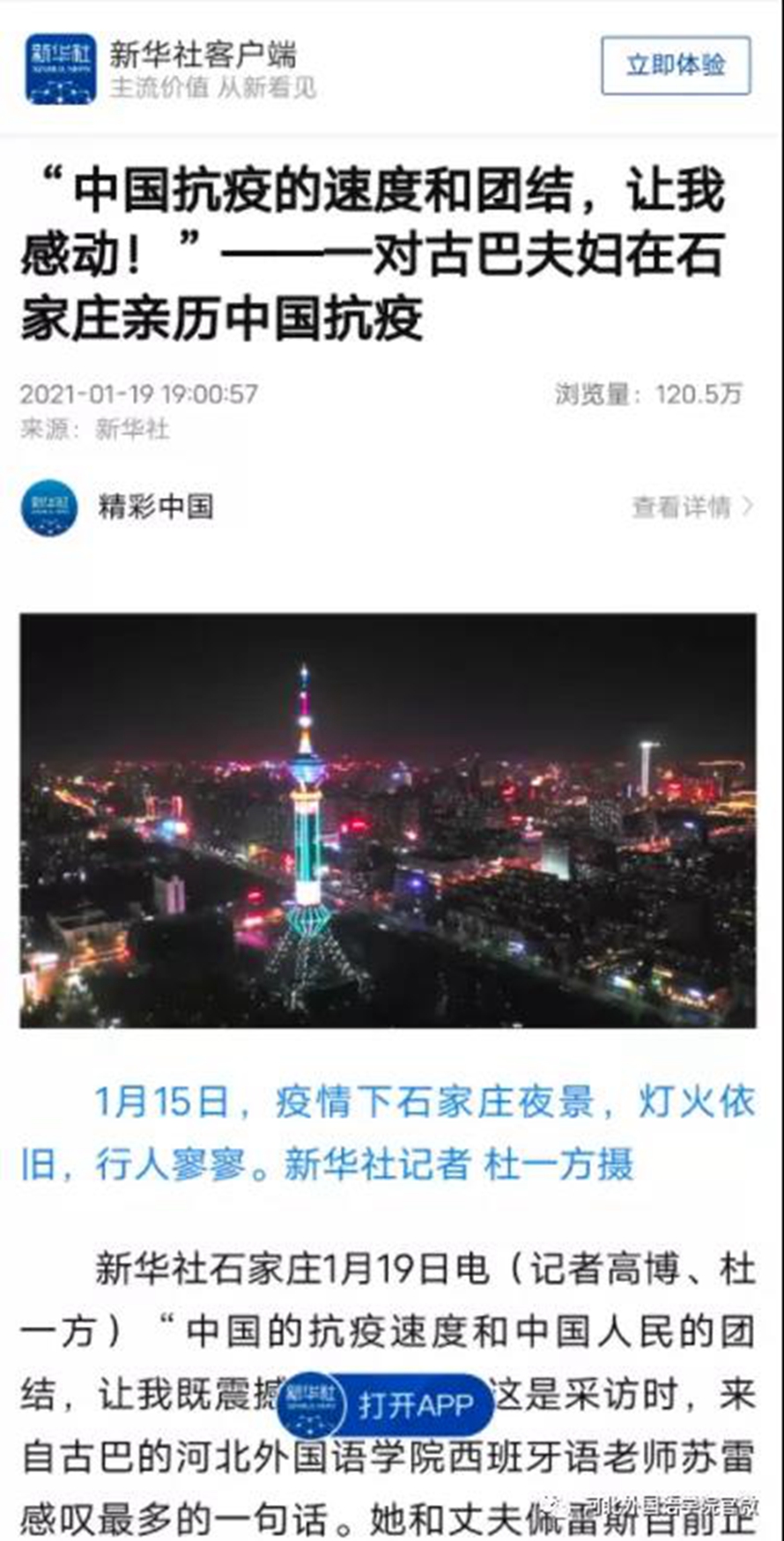 新华社、人民日报、古巴贸易通、参考消息、中国新闻网、光明网报道河北外国语学院外籍教师亲历中国抗疫