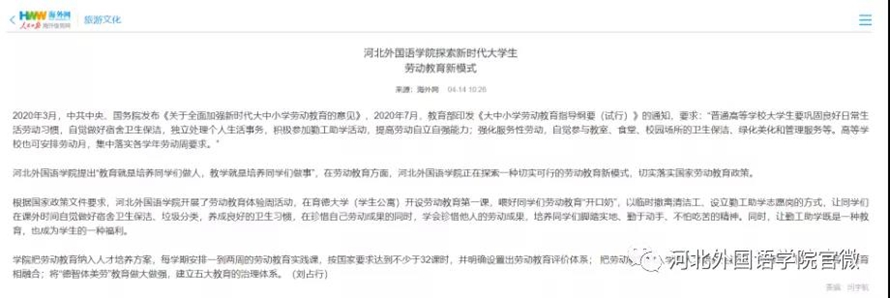 人民日报海外网报道河北外国语学院探索新时代大学生劳动教育新模式