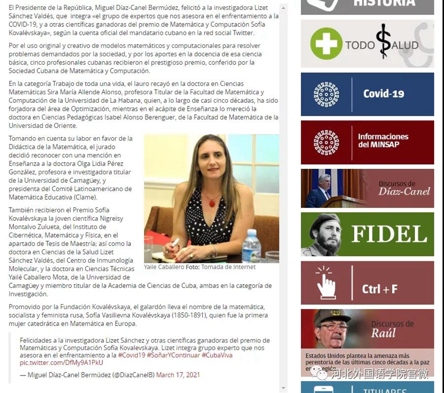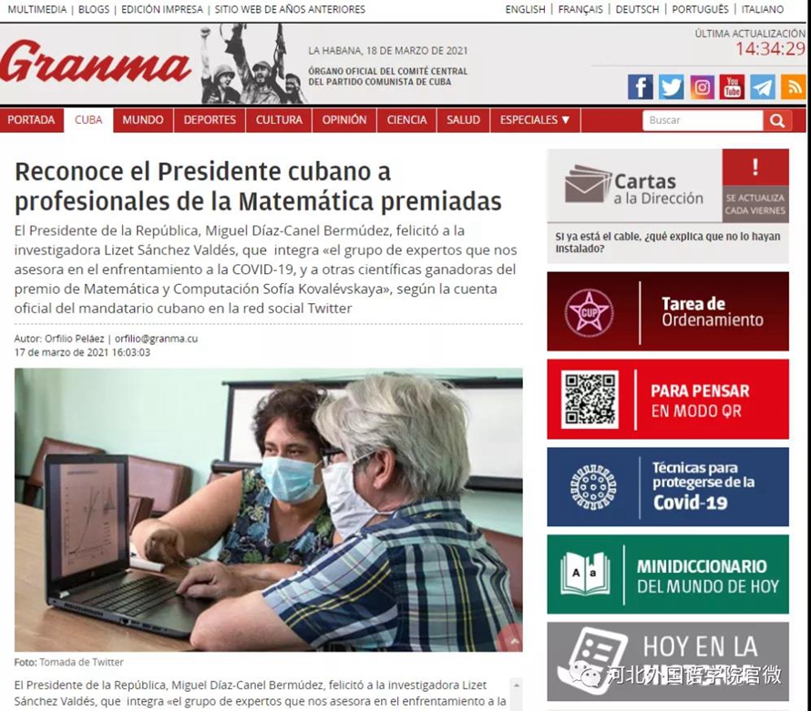 古巴人民日报报道河北外国语学院雅伊雷院士获得索菲娅·科瓦列夫斯卡娅奖