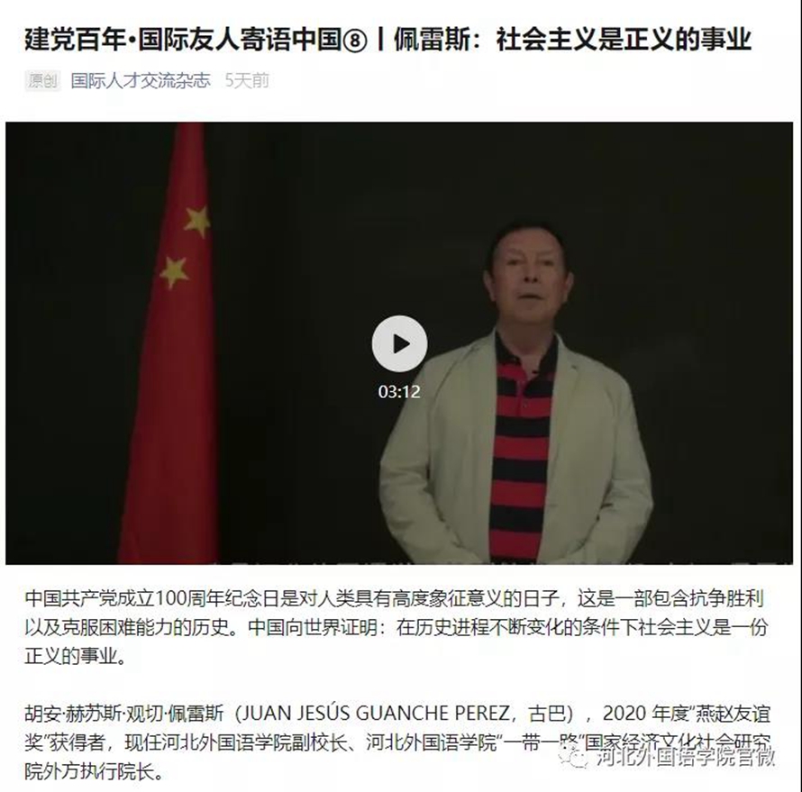 长城网、国际人才交流杂志、河北省科技厅报道河北外国语学院外籍专家为中国共产党成立100周年献词