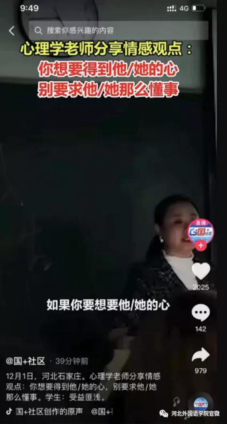 河北广电报业融媒体号转发河北外国语学院国际语言教育李木子老师主讲的大学生情感交流课。