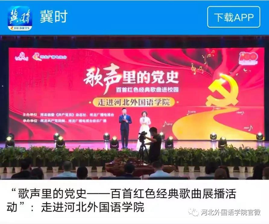 河北广播电视台冀时客户端全程直播、人民日报海外网报道“歌声里的党史——百首红色经典歌曲展播活动”走进河北外国语学院