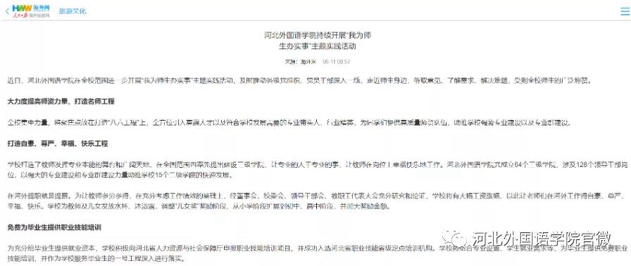 人民日报海外网、人民网人民科技等报道河北外国语学院持续开展“我为师生办实事”主题实践活动
