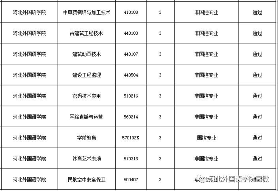 2021年,河北外国语学院新增学前教育国控专科专业及中草药栽培与加工技术、古建筑工程技术、建筑动画技术、建设工程监理、密码技术应用、网络直播与运营、体育艺术表演、民航空中安全保卫等8个非国控专科专业,共计9个专科专业,在2022年单招批次和专科批次招生,敬请关注我校2022年详细招生计划。
