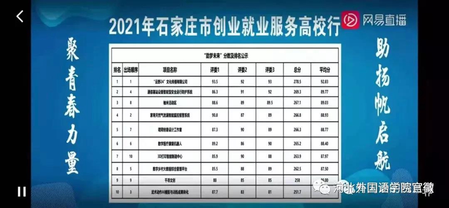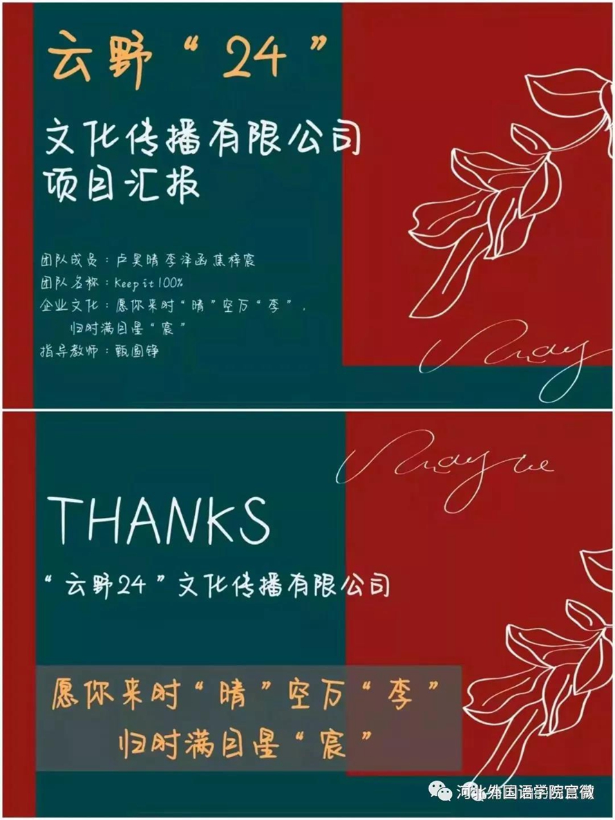 在“聚力谱新篇”和“助梦未来”板块中,河北外国语学院西意葡语言学院“云野24文化传播有限公司”项目顺利入围全市前十,并在决赛中取得第一名的好成绩。