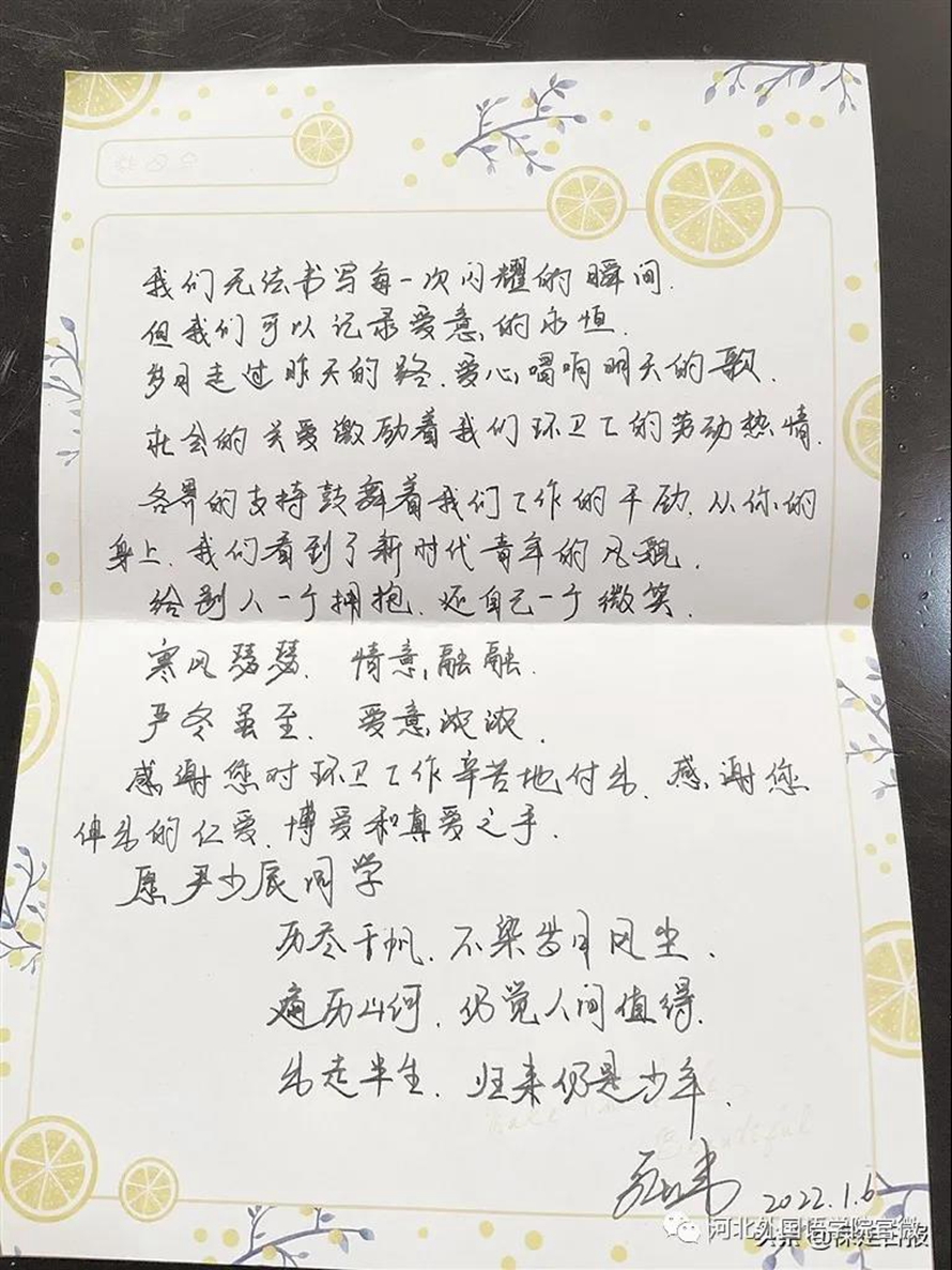 1月7日当天,尹少辰和岳秉泽代表四人,将用他们的奖学金、勤工俭学收入和工资收入购买的价值700元左右的消毒液、口罩、手套等爱心物资捐赠给了竞秀区城市管理综合行政执法局环卫处。在之前的联系沟通后,环卫处处长张伟对四个小伙伴的善举也十分感动,提前亲笔为他们准备了一封感谢信,见面后送到他们手上:“各界的支持鼓舞着我们工作的干劲,从你们的身上,我们看到了新时代青年的风貌……愿你们,历尽千帆,不染岁月风尘;遍历山河,仍觉人间值得;出走半生,归来仍是少年。”张伟的感谢信感情真挚,读来让人动容。