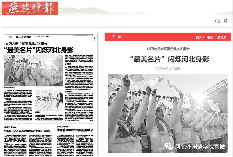 随着2022年北京冬奥会的日益临近,“冬奥会志愿者”这张靓丽的名片倍受关注,河北外国语学院冬奥会志愿者的故事被多家媒体转载报道,河北外国语学院英语专业彭薪樾同学是1.9万志愿者当中的一员,她参加冬奥会志愿者培训时的照片刊登在燕赵晚报,为志愿者代言。