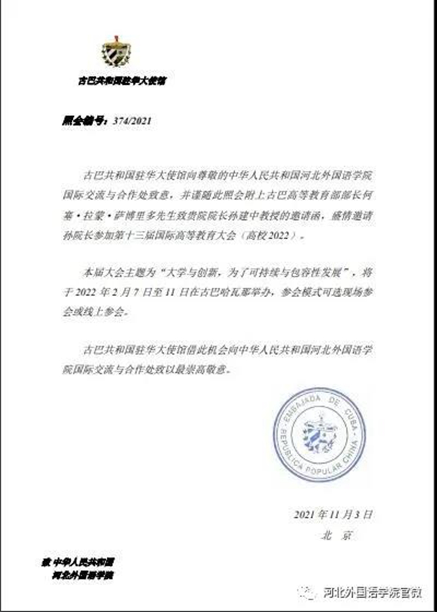 2021年11月份,河北外国语学院董事长、校长孙建忠院士分别收到古巴高等教育部部长何塞•拉蒙•萨博利多先生和古巴驻华大使馆参会邀请函。