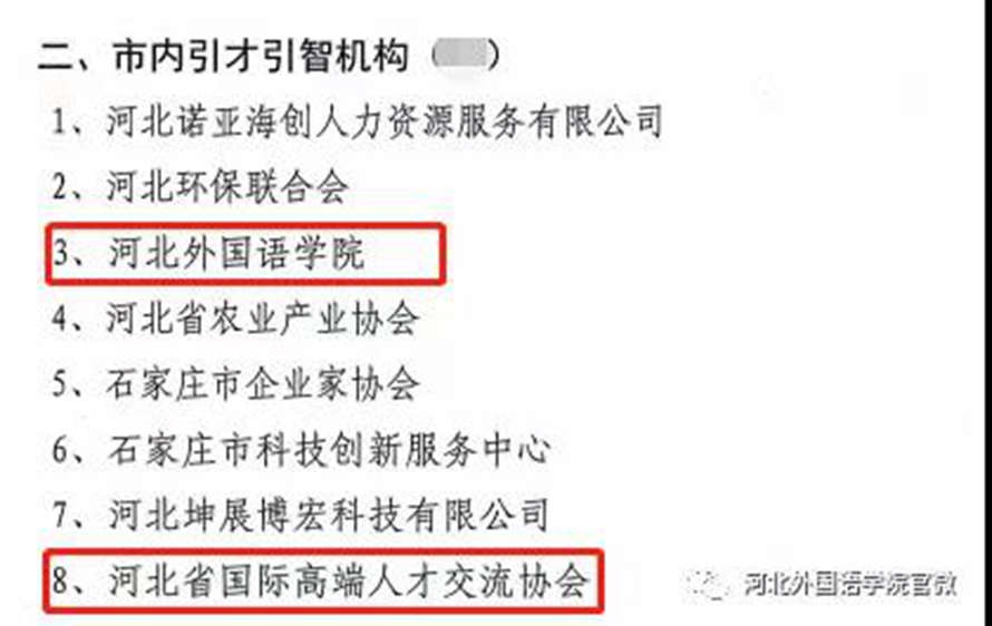 好消息!近日石家庄市科学技术局发布《关于认定2022年度石家庄市引智工作站的通知》,认定河北外国语学院及其发起成立的河北省国际高端人才交流协会为“石家庄市2022年度引智工作站”。