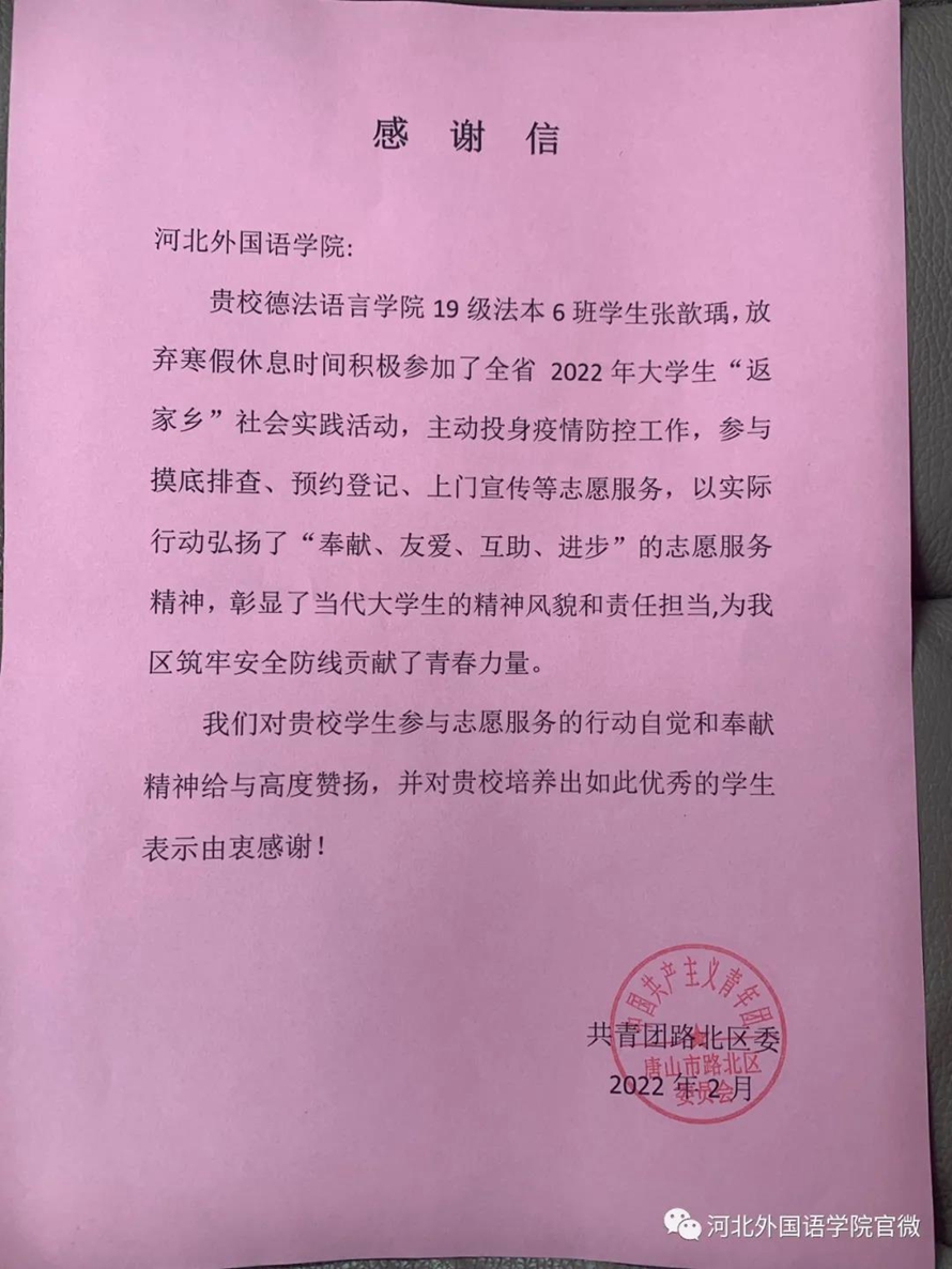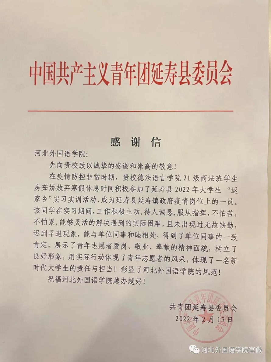 近日,河北外国语学院又收到两封感谢信,学校德法语言学院19级法本6班张歆瑀、21级商法班房茹娇,放弃寒假休息时间,积极参加2022年大学生“返家乡”社会实践活动,主动投身疫情防控工作,以实际行动弘扬“奉献、友爱、互助、进步”的志愿服务精神,彰显了当代大学生的精神风貌和责任担当。