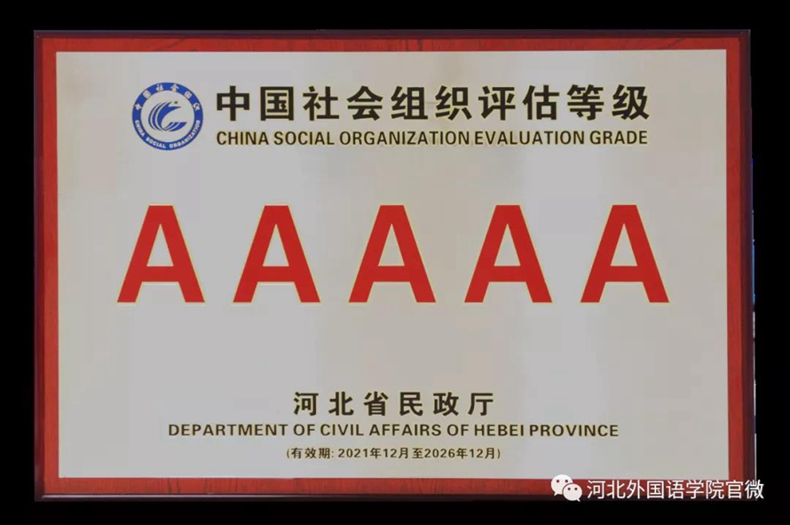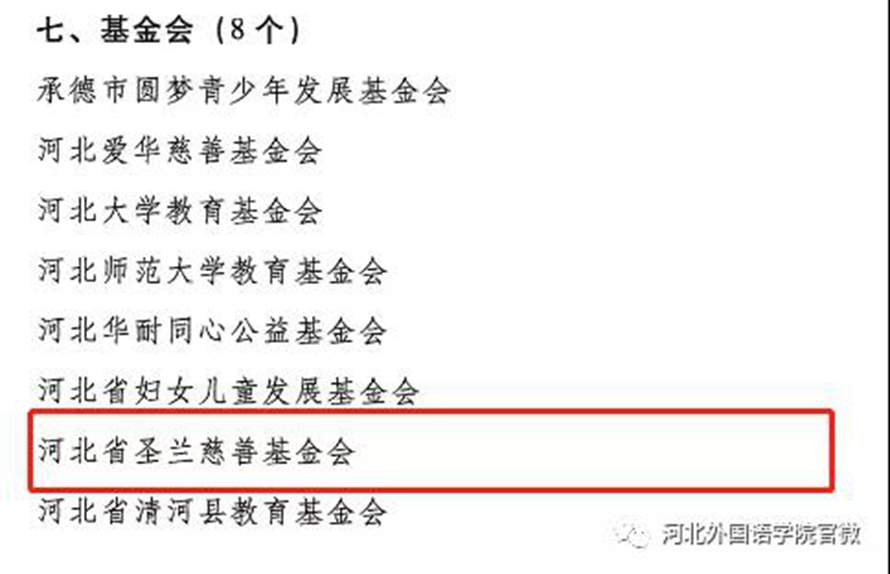 近日,河北省民政厅发布《关于2021年度社会组织评估结果的通报》,经评估委员会评审,河北外国语学院发起成立的河北省圣兰慈善基金会被评为5A级社会组织。