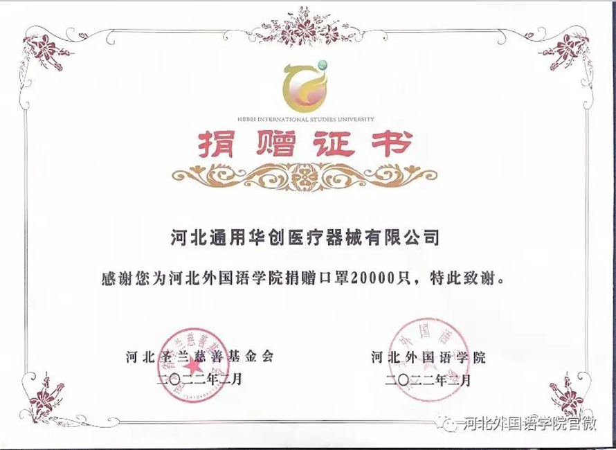 上午十点,河北通用华创医疗器械有限公司向河北外国语学院捐赠KN95口罩20000只,为学校的防疫工作贡献了重要力量。公司行政部经理魏云静专程来到学校,亲手把口罩交到学校副校长陈乐音和财务总监孙冉手中。
