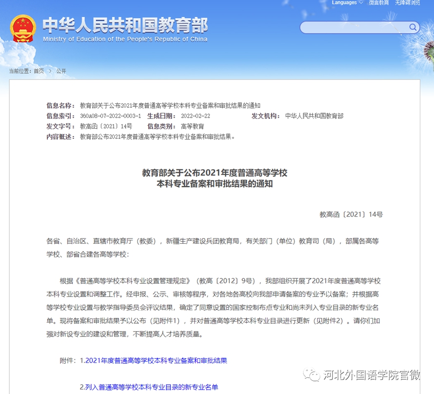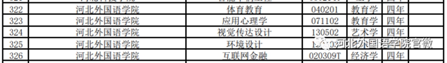 近日,教育部下发《教育部关于公布2021年度普通高等学校本科专业备案和审批结果的通知》(教高函〔2021〕14号),河北外国语学院体育教育(040201)、应用心理学(071102)、视觉传达设计(130502)、环境设计(130503)、互联网金融(020309T)等5个专业入选新增备案本科专业名单,进一步优化了河北外国语学院学科专业结构布局,这些专业将于2022年开始招生。