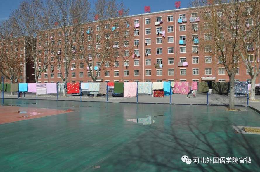 那边认真打扫担当区 晒被子、踢球、跳舞、闲聊的同学们让操场也热闹起来了