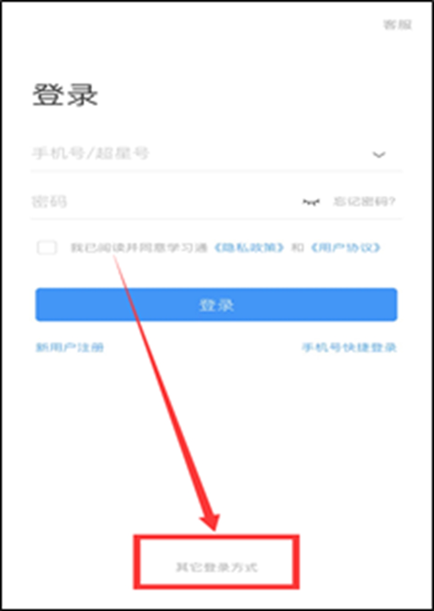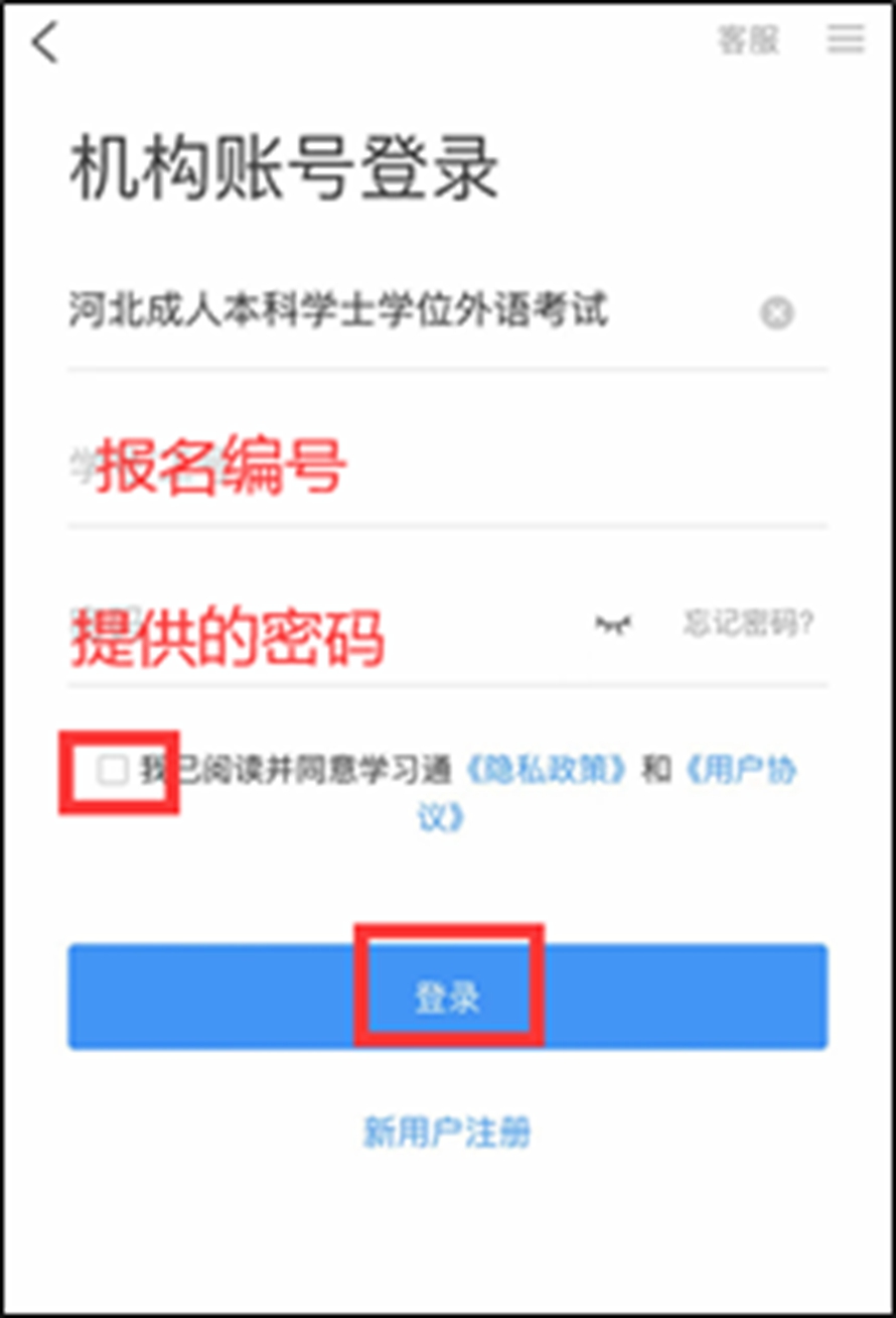 (二)注册登录:打开“学习通”,在登录页面点击下方“其他登录方式”,使用机构账号进行登录。“学校/单位”中输入“河北成人本科学士学位外语考试”,“学号/学工号”为本人报名编号(13212开头),密码为“ks+准考证号后8位”,密码示例:ks40256312。勾选“我已阅读并同意学习通协议”,点击登录。