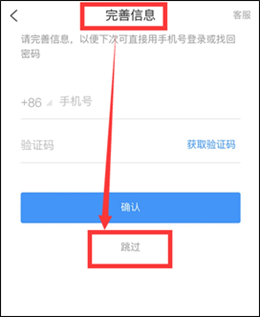 “完善信息”页面,点击“跳过”,直接登录进入。