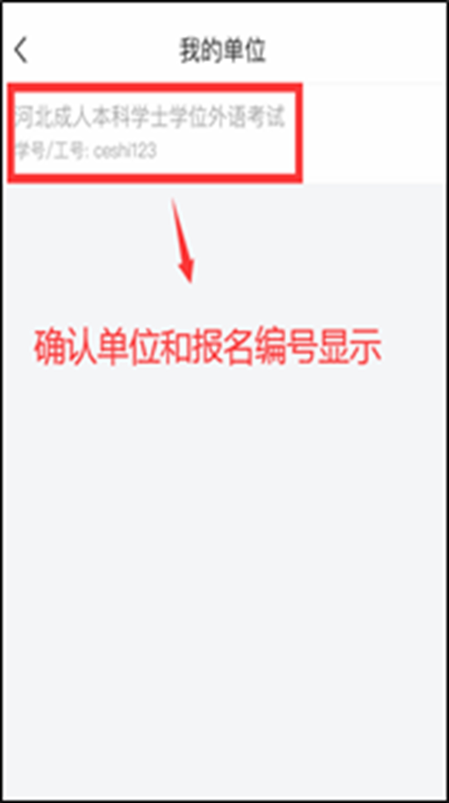 登录进入后,单击底菜单“我”,查看界面上方显示的是否为自己的姓名,确认姓名显示无误。再点击此界面的“设置”--“账号管理”--“单位设置”--“我的单位”列表是否显示“河北成人本科学士学位外语考试”和自己的报名编号,确认单位和报名编号信息显示无误。
