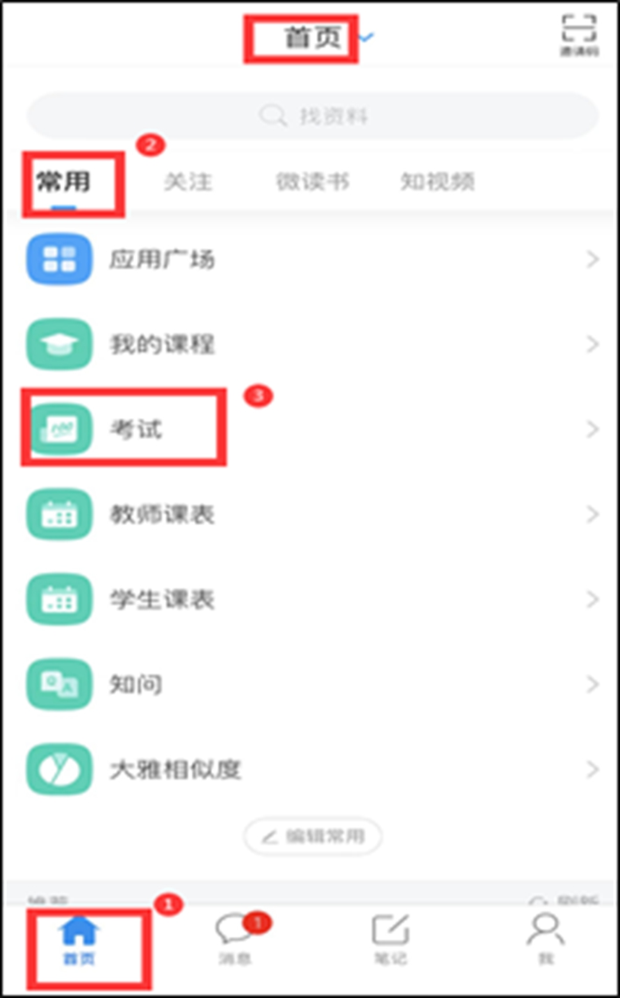(一)登录进入后,点击学习通底菜单“首页”--“常用”板块点击“考试”,考试列表会显示考试名称,进入对应考试。