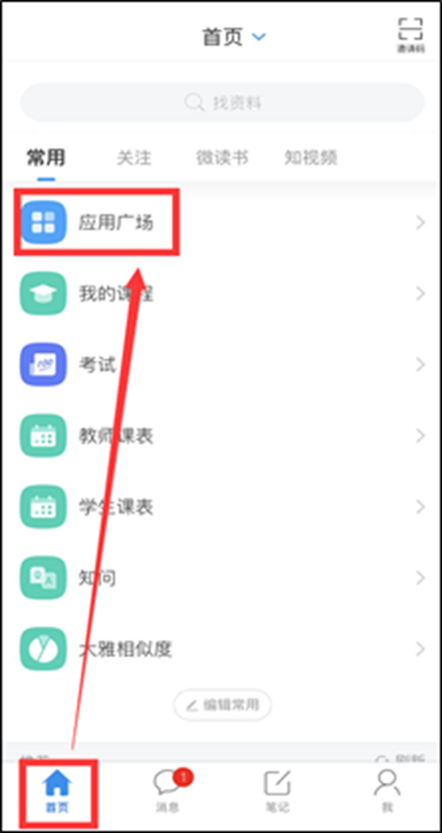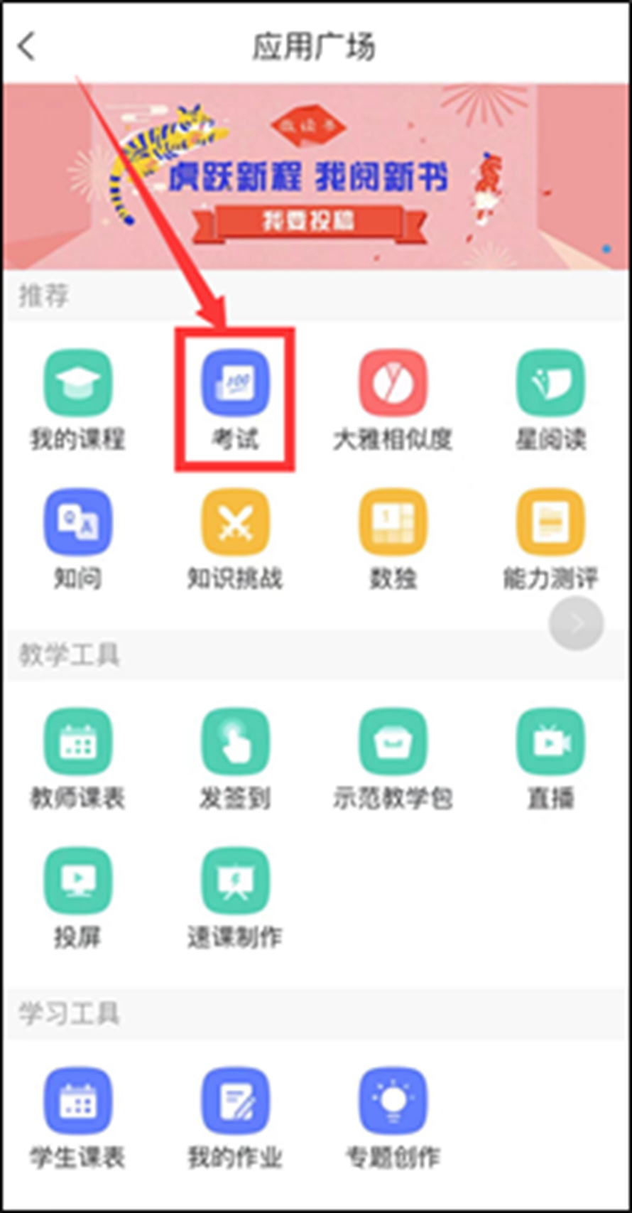 若常用板块没有显示“考试”,可点击“应用市场”--“考试”查看。