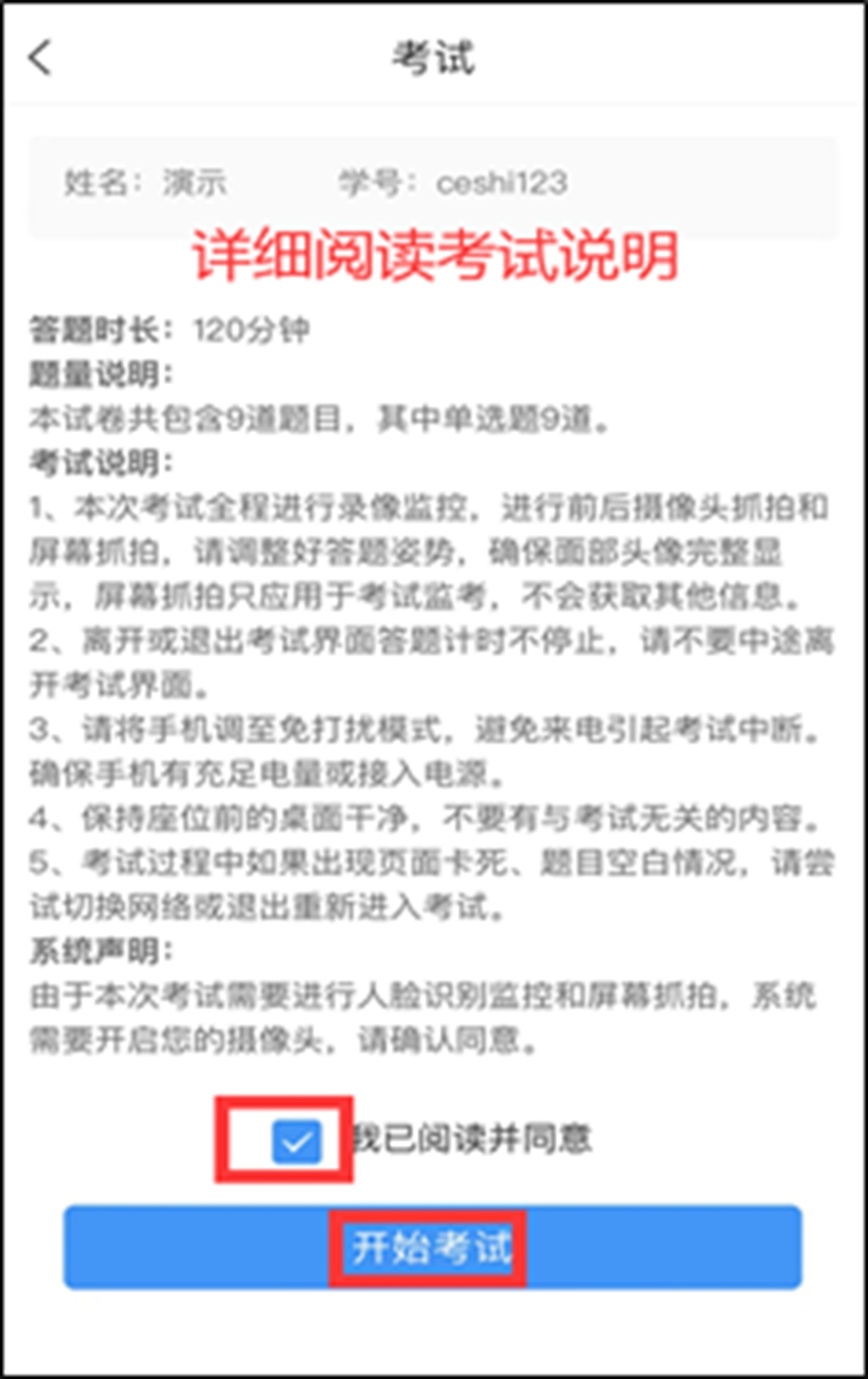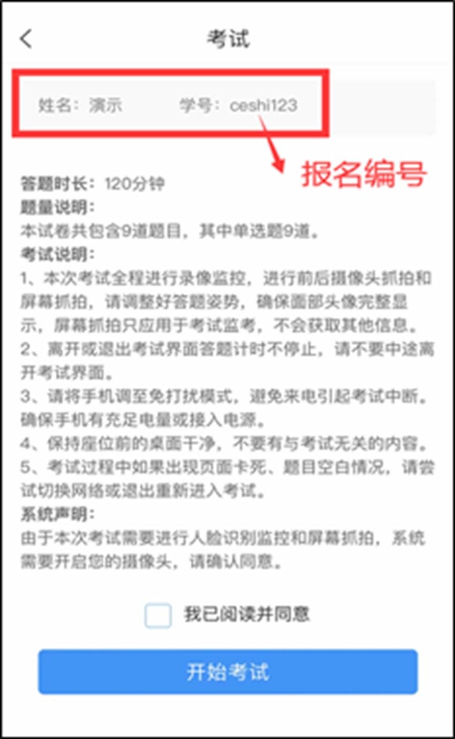在考试说明页面核对考生信息,查看考生姓名和报名编号是否正确。详细阅读考试说明后,勾选“我已阅读并同意”,点击“开始考试”。