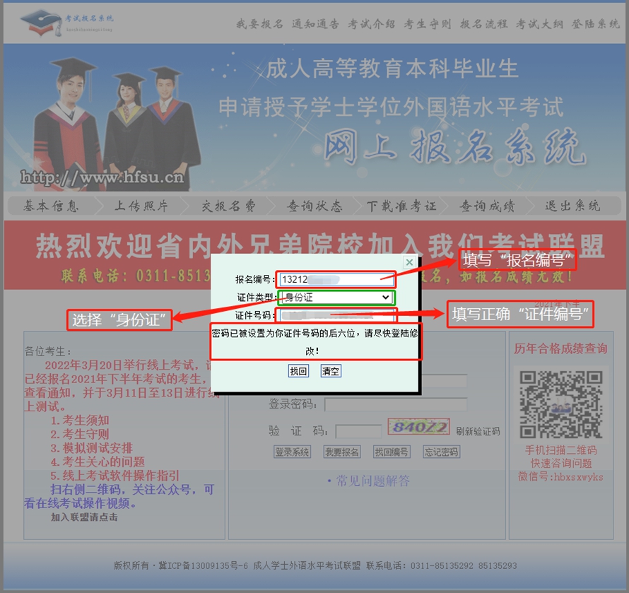 填写“报名编号”,选择“证件类型”,输入正确“证件号码”,点击找回,密码自动设置为证件号码的后六位。
