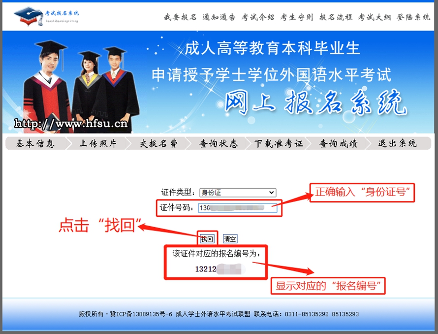 输入证件号码(仔细核对证件证号,是否正确),点击找回,下方显示对应的报名编号。
