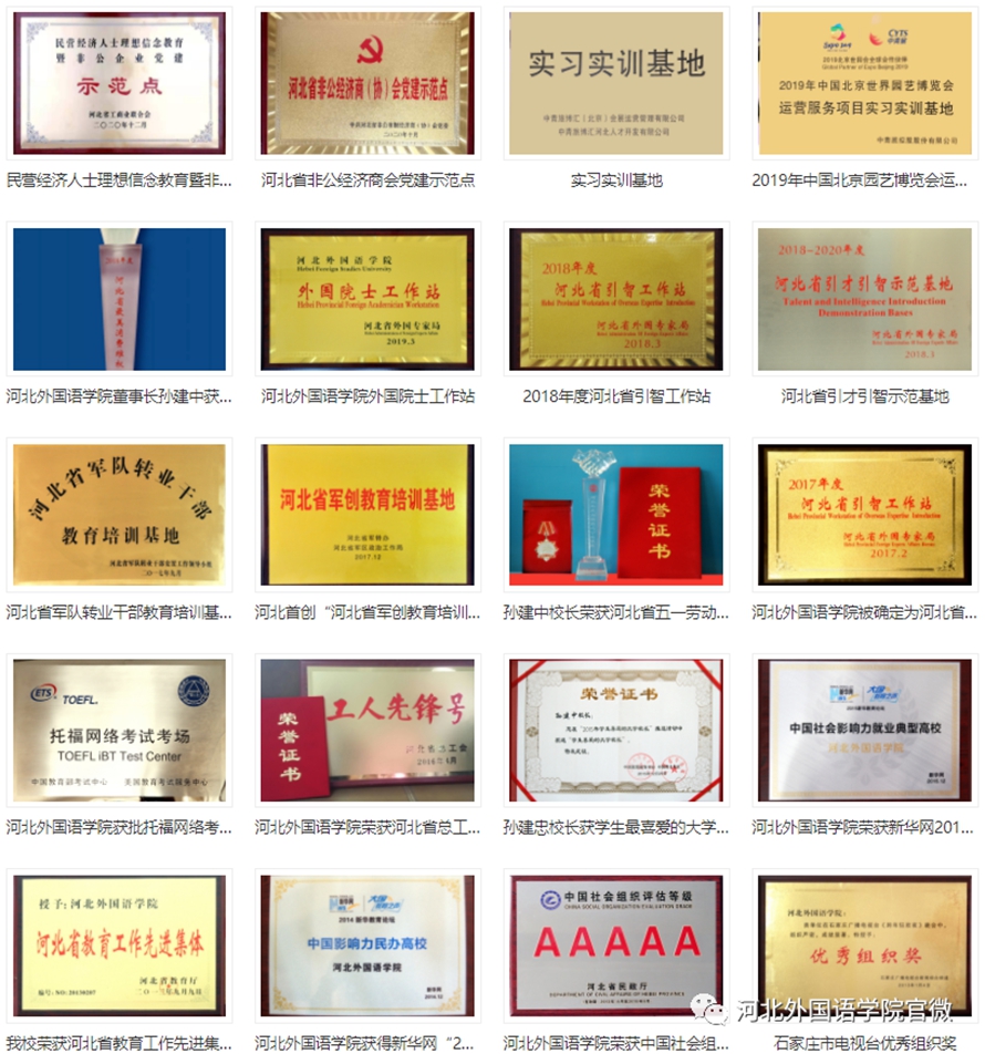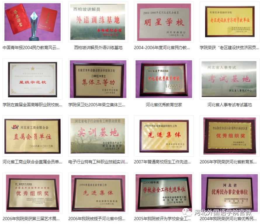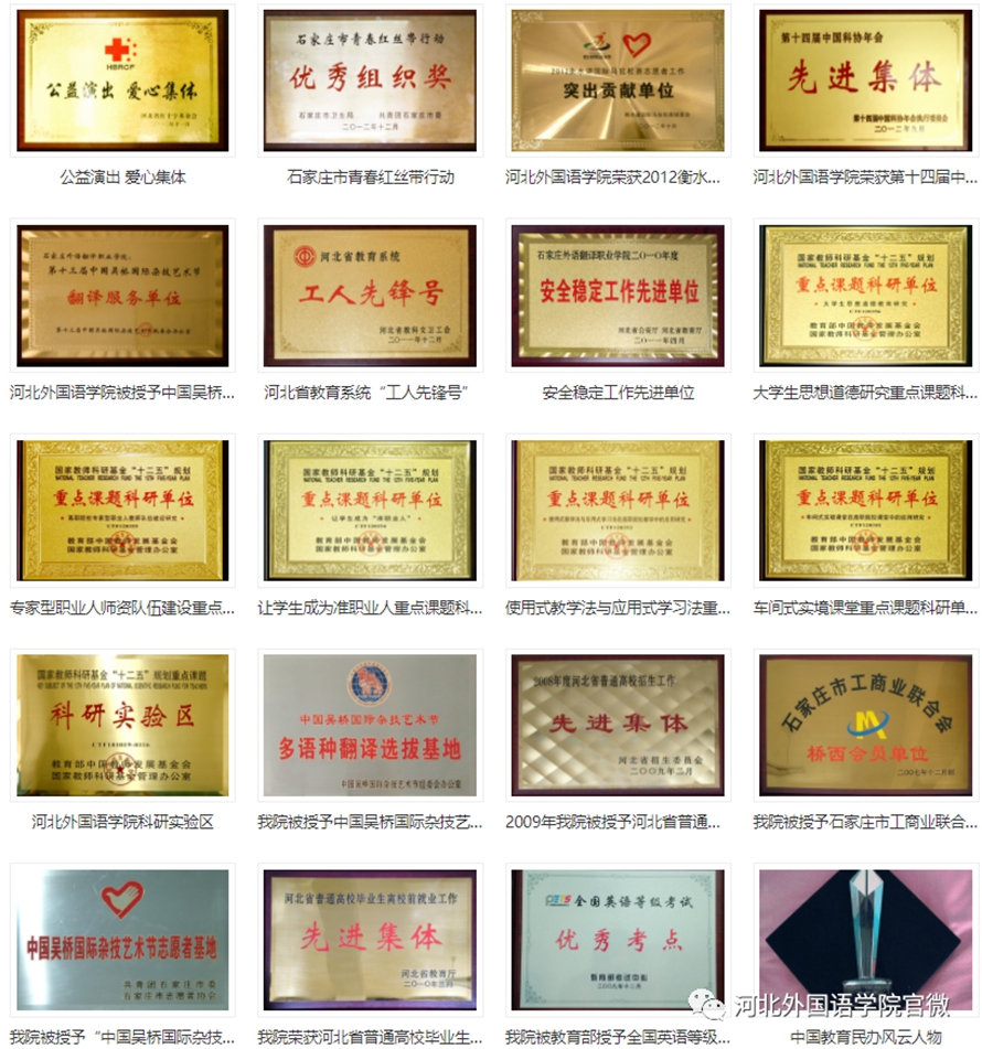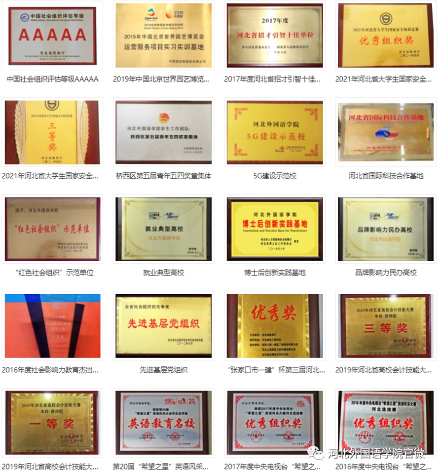 为此,河北外国语学院引进各界高端专业人才,培育新时代优秀青年人才,为地方、国家社会性活动提供力所能及的服务与保障。多年来,河北外国语学院在组织知识技能竞赛、学生管理、社会服务、引才引智、等方面取得了一系列荣誉。