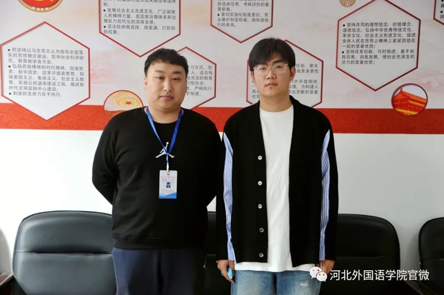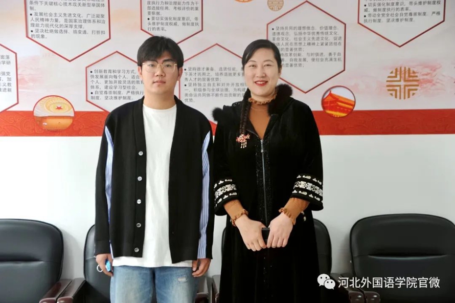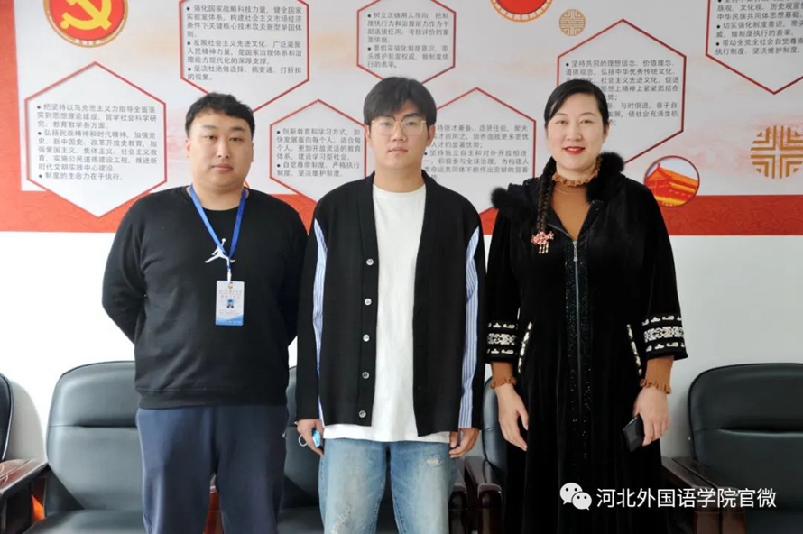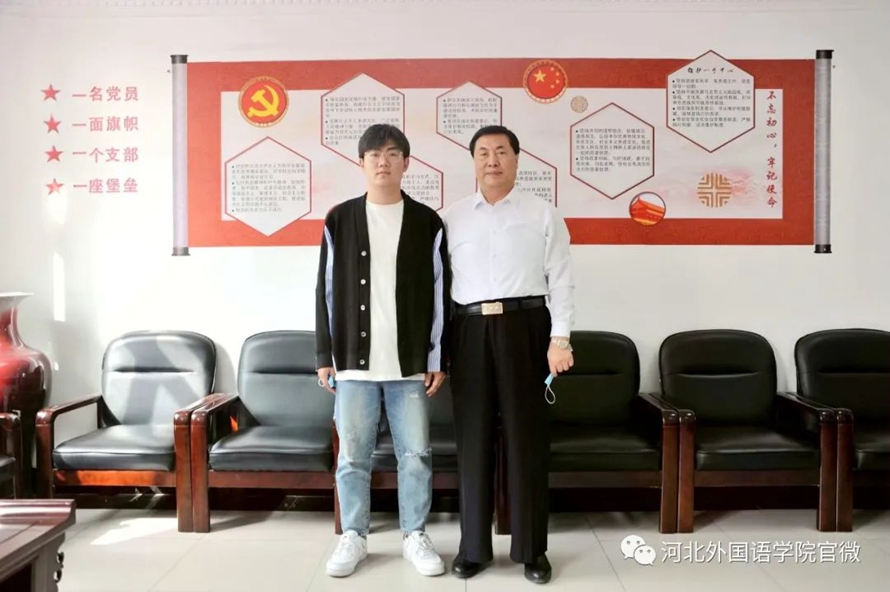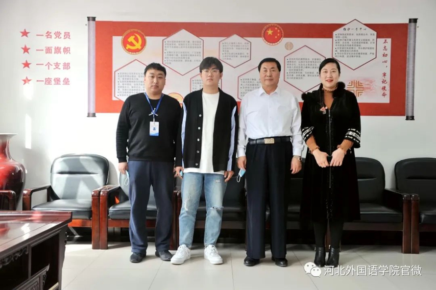 河北外国语学院董事长、校长孙建忠院士亲切接见,并感谢谷茂源同学及其家人对学校的热爱和肯定,同时也鼓励谷茂源同学继续树立旗帜,率先垂范,勇争第一。