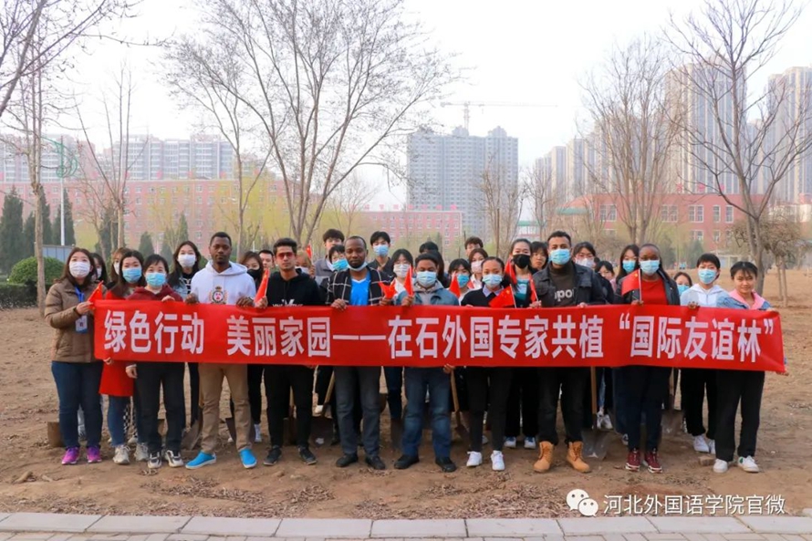 来自保加利亚、泰国、韩国、古巴、津巴布韦、肯尼亚、马达加斯加、喀麦隆等国家在石外国专家参加了义务植树活动,种下了象征友谊的月季、龙爪槐、杨树等树木,河北省校企合作促进会、河北省国际高端人才交流协会、河北省农业产业协会人员参加了此次义务植树活动。