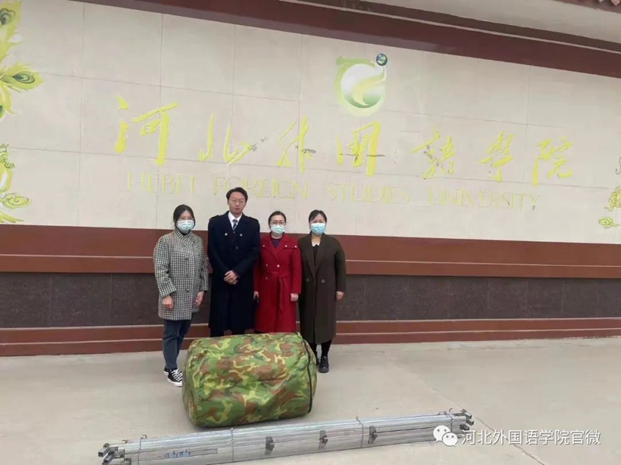 疫情防控人人有责。面对当前疫情形势,河北外国语学院积极应对、筹备防疫物资,得知学校要设置临时安置隔离设施,河外学子及家长纷纷向学校捐赠防疫物资,其中航空旅游学院崔子硕、王福谊两名同学及家长向河北外国语学院捐赠3顶帐篷、5把手持测温枪。