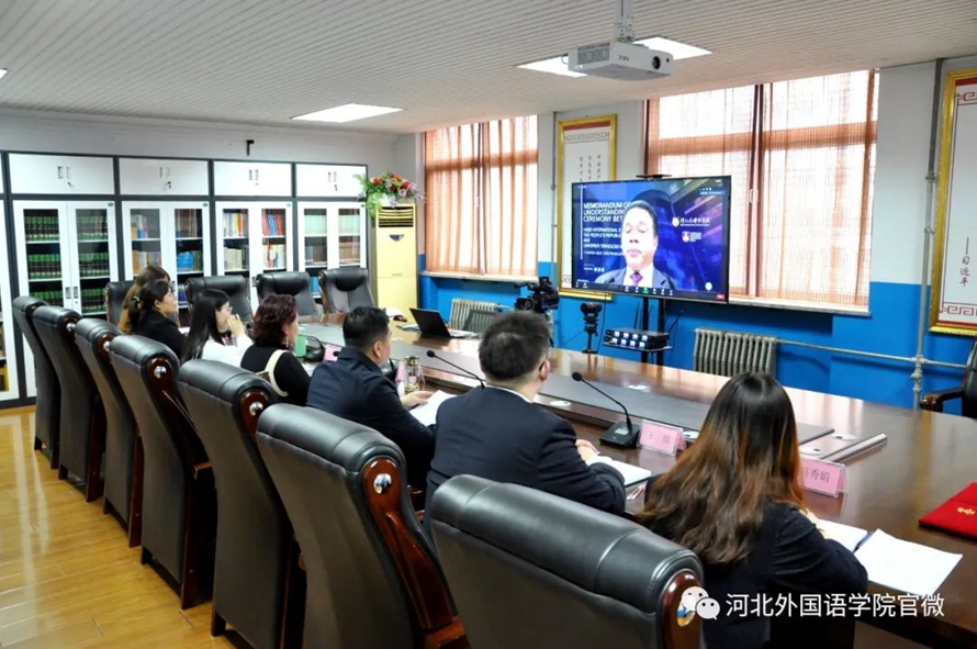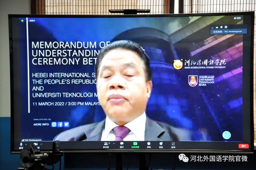 2022年3月11日下午15:00时,在专家教授楼四楼民主厅,河北外国语学院副董事长、执行校长习伟教授与马来西亚玛拉工艺大学Haji Mohamad Fozi Ali校长在双方领导老师代表的见证下,通过网络视频会议的形式签署合作协议。