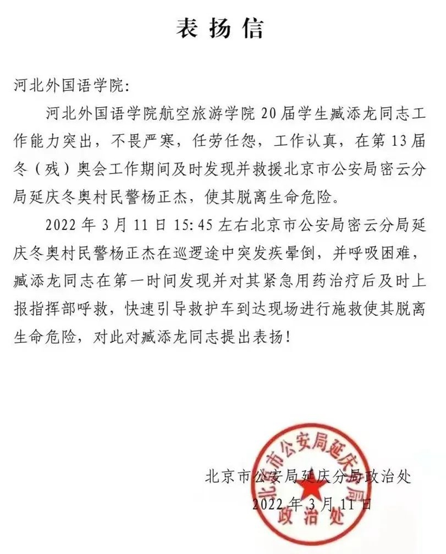 近日,河北外国语学院收到一封来自北京市公安局延庆分局政治处的表扬信,学校航空旅游学院20级空本1班臧添龙同学,在冬(残)奥会志愿服务工作期间,及时发现并救援北京市公安局密云分局延庆冬奥村民警杨正杰,使其脱离生命危险。