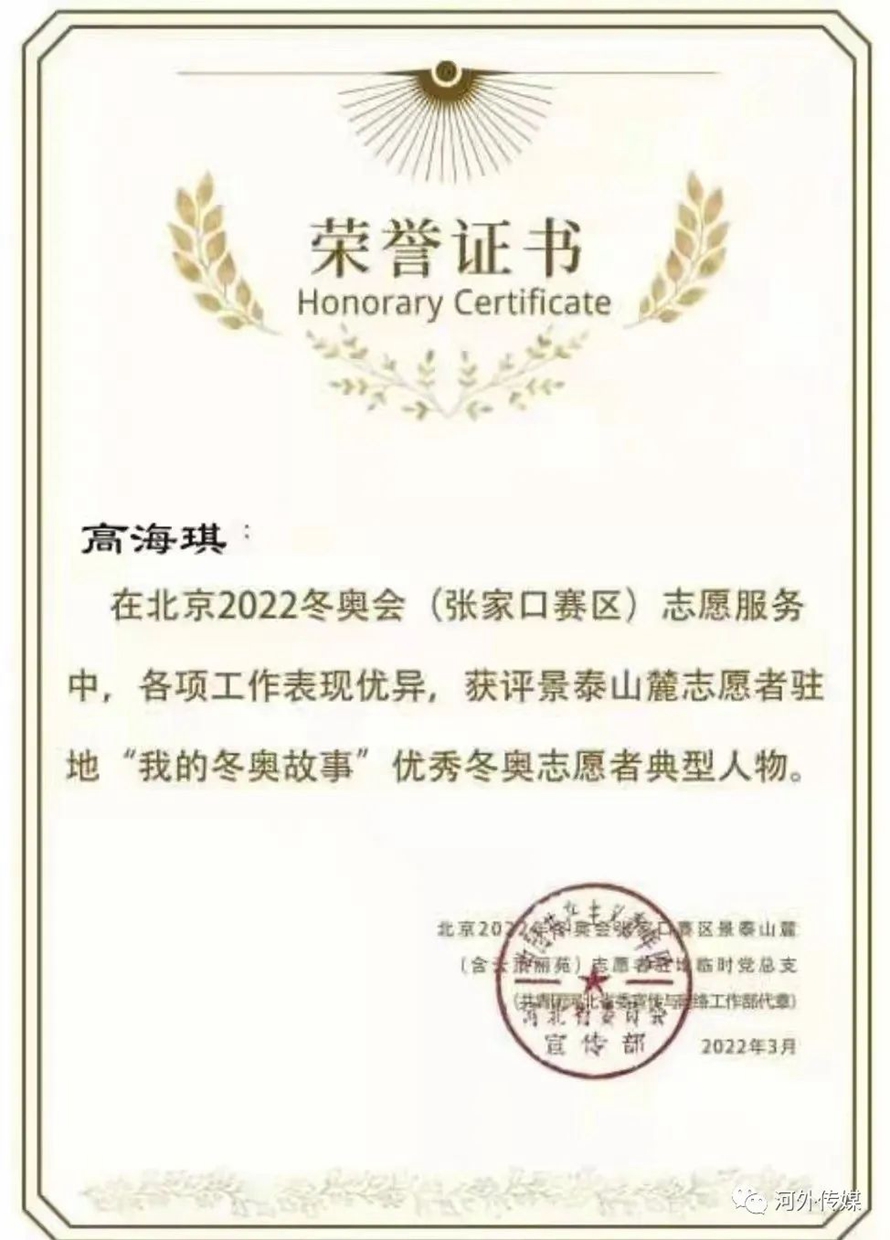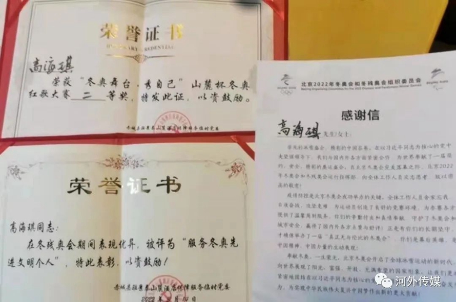 在志愿服务的这五十天里,虽然每天都戴着口罩,但一直让眉眼带笑,让每一位不远千里来到中国的运动员,感受中国志愿者的热情和活力,传递微笑“名片”。志愿服务结束后,高海琪也得到张家口赛区的多封表扬信、感谢信。