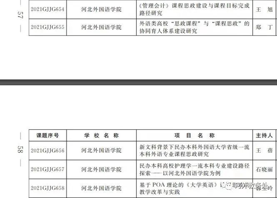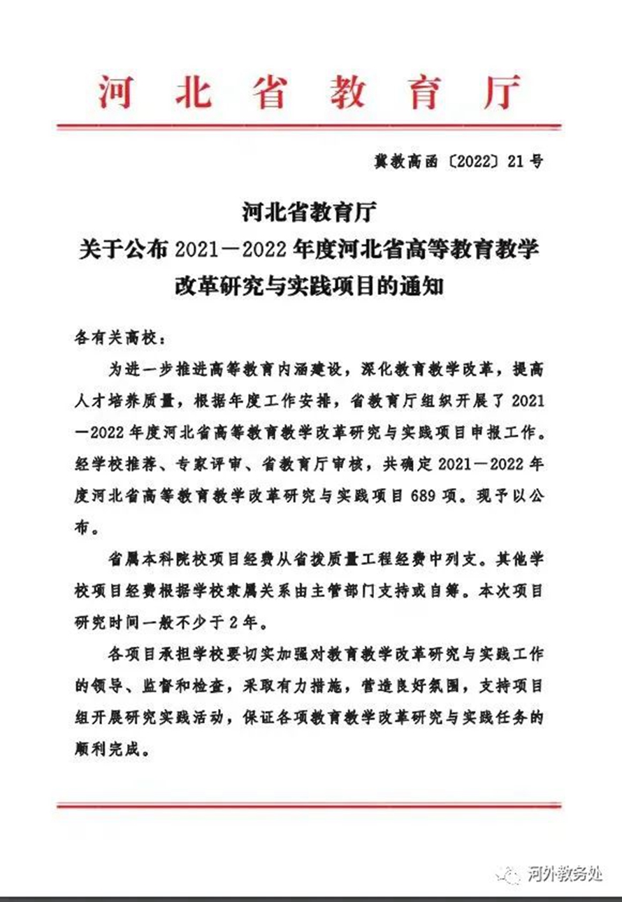 近日,《河北省教育厅关于公布2021-2022年度河北省高等教育教学改革研究与实践项目的通知》发布,河北外国语学院5个项目获批河北省高等教育教学改革研究与实践项目。