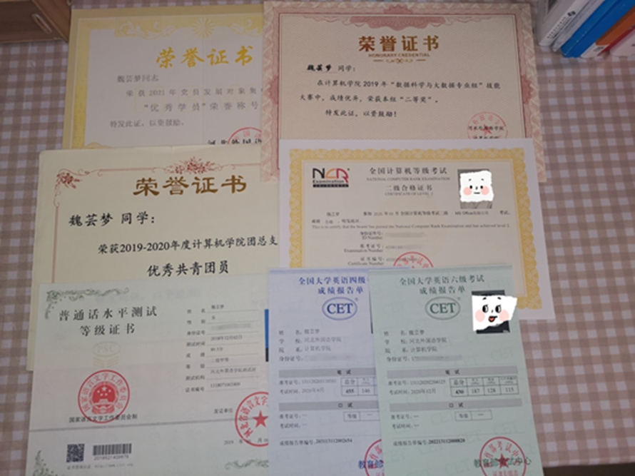 魏芸梦,“优秀学员”“优秀共青团员”,在校期间曾荣获计算机学院2019年“数据科学与大数据专业组”技能大赛二等奖,英语四六级考试,普通话水平测试,全国计算机等级考试等证书也不在话下。
