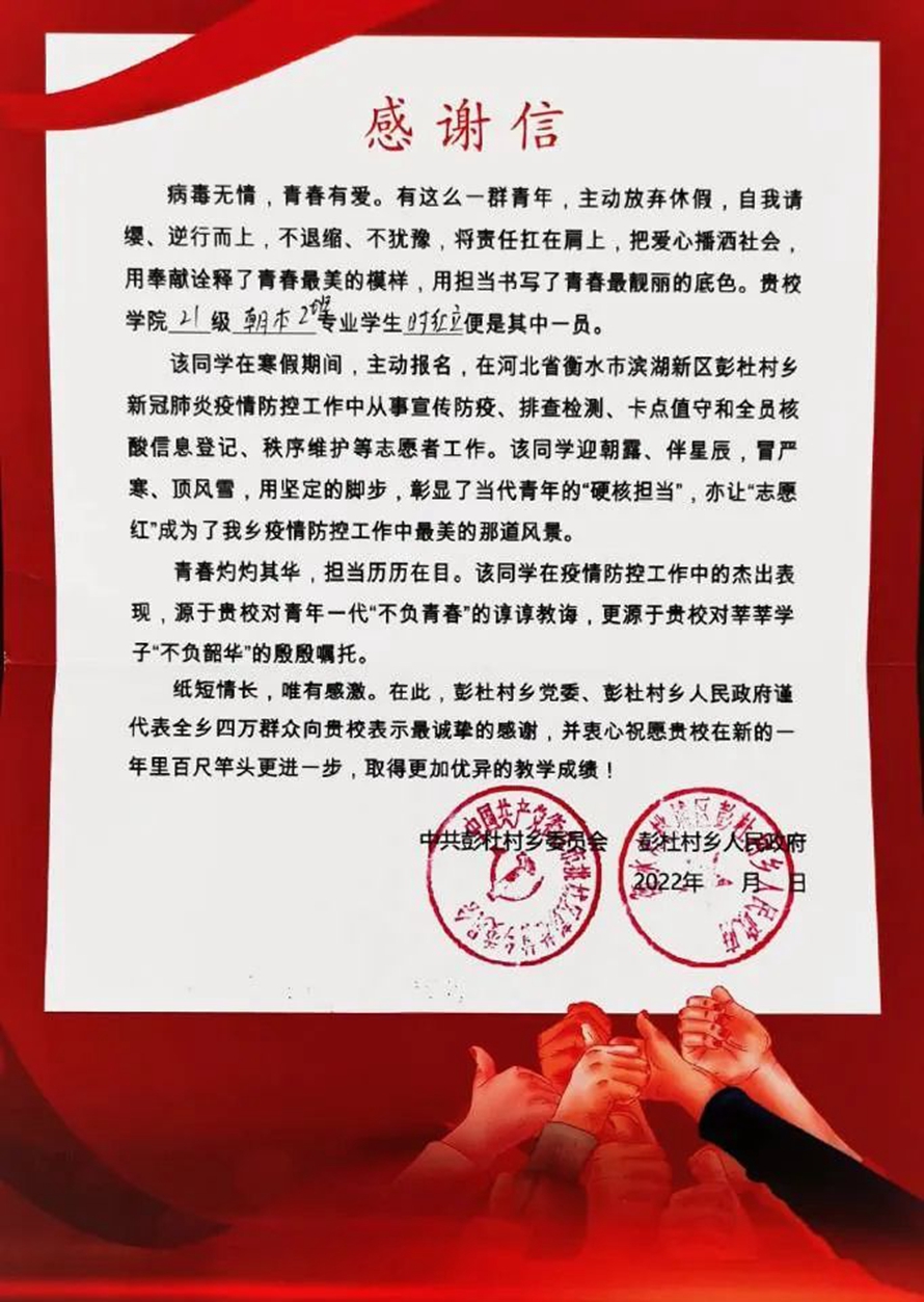 该同学在寒假期间,主动报名,在河北省衡水巿滨湖新区彭杜村乡新冠肺炎疫情防控工作中从事宣传防疫、排查检测、卡点值守和全员核酸信息登记、秩序维护等志愿者工作。该同学迎朝露、伴星辰,冒严寒、顶风雪,用坚定的脚步,彰显了当代青年的“硬核担当”,亦让“志愿红”成为了彭杜村乡疫情防控工作中最美的那道风景。