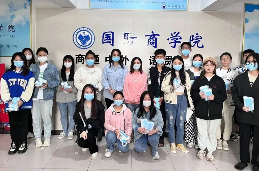 2. 5月9日,河北外国语学院国际商学院为学子发放爱心口罩,携手构建安全、稳定、和谐校园。