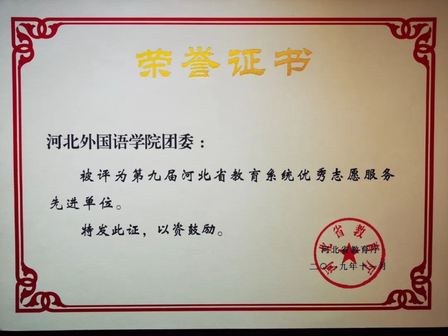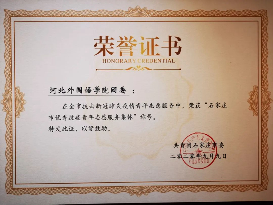 就在几天前,河北外国语学院团委被团中央实名表扬,被授予“迎冬奥,我来赛!”网络知识竞赛“优秀组织奖”荣誉。河北外国语学院团委多次被表彰,曾获2019年河北省学校思想政治教育工作先进集体荣誉称号、2019年度“石家庄市青年志愿服务工作先进单位”称号、2020年被评为第九届河北省教育系统优秀志愿服务先进单位、“石家庄市优秀抗疫青年志愿服务集体”称号等荣誉。