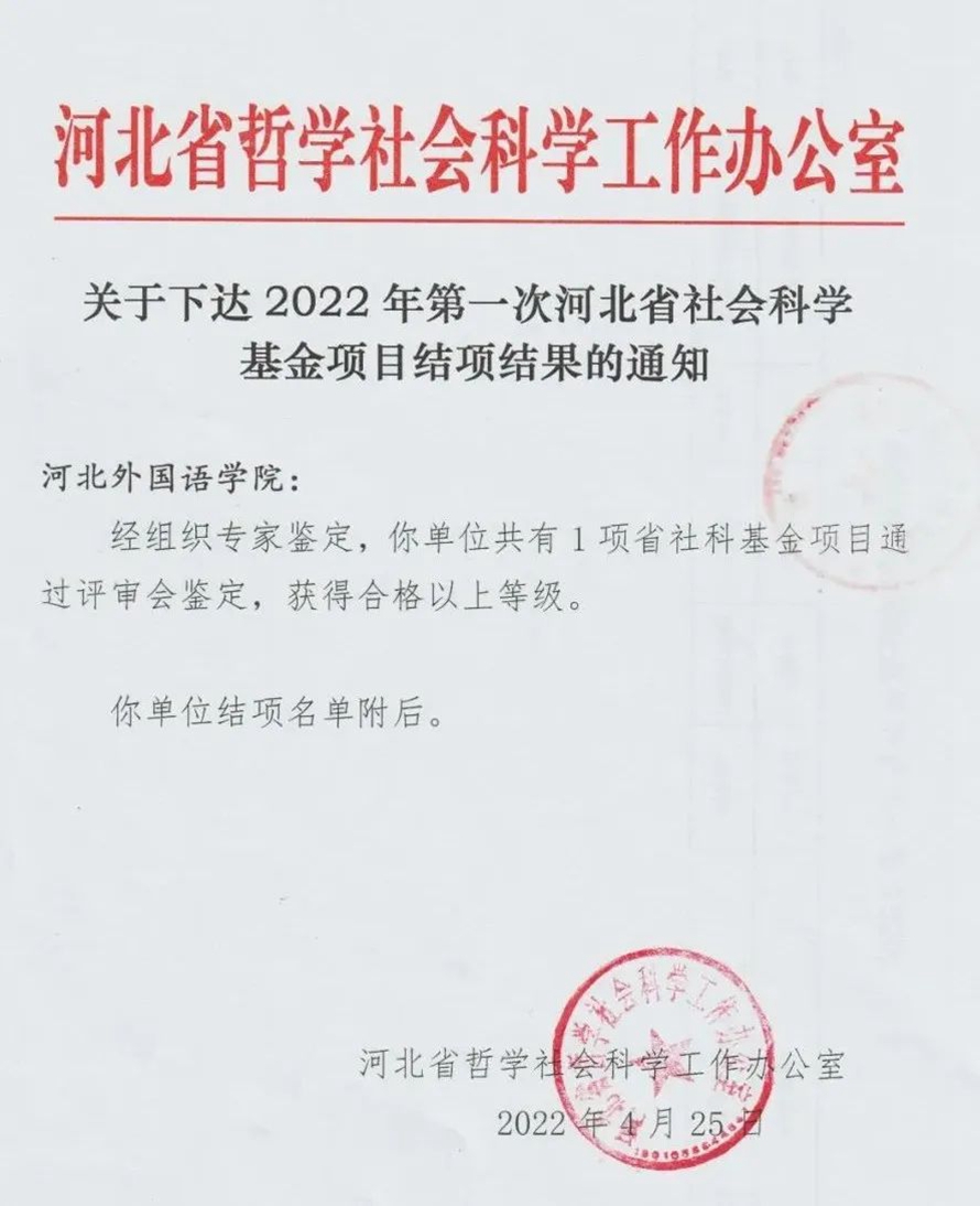 此次河北省社会科学基金项目顺利结项,表明我校的科研成果受到了省内同行专家的高度认可。同时,这也是科学技术处落实孙建忠院士“五本”科研的突出展现,这也成为了我校全体教师科研工作新的风向标和灯塔。