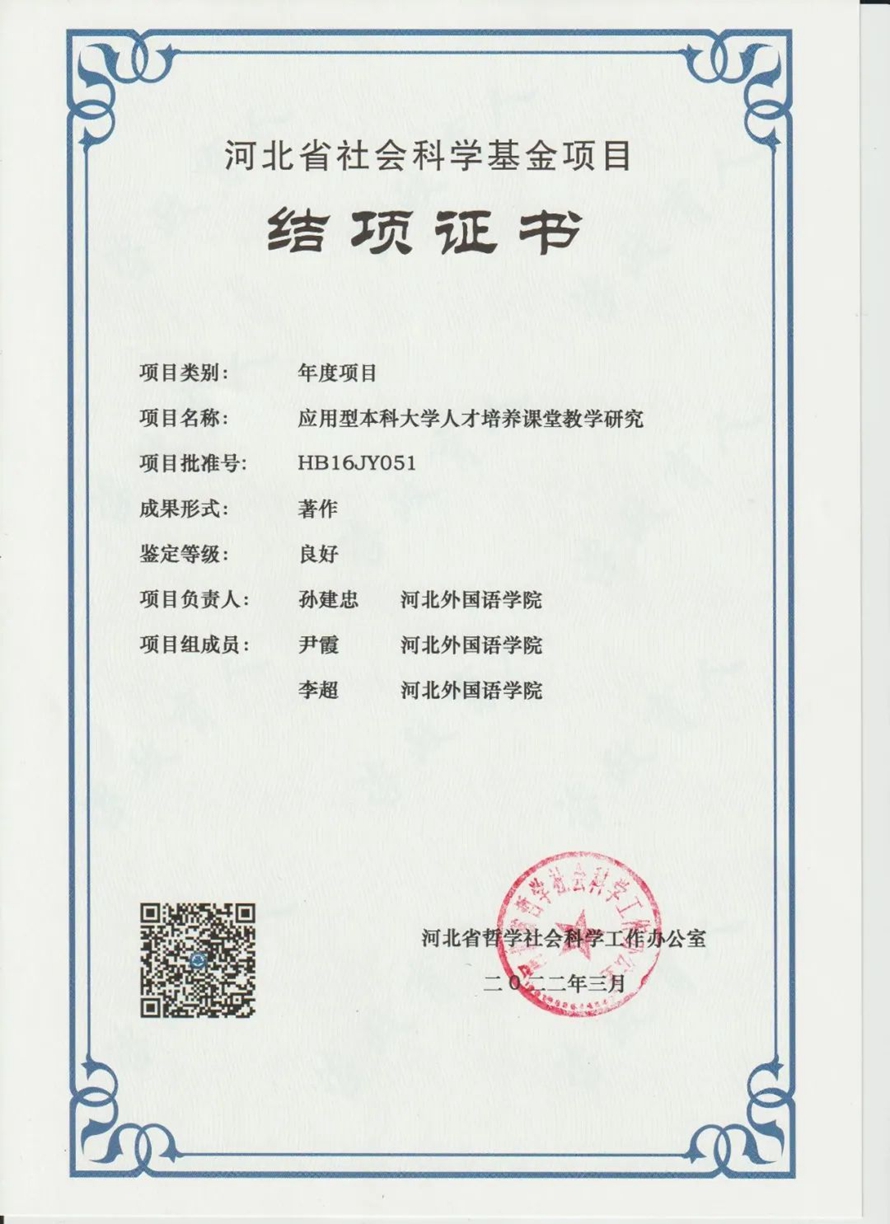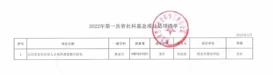 近日,河北外国语学院科研成果又传佳讯——由董事长、校长孙建忠院士主持的“应用型本科大学人才培养课堂教学研究”项目顺利结项,并获“良好”等级!本项课题为河北外国语学院首项河北省社会科学基金项目,填补了学校在河北省社会科学基金项目上的空白。