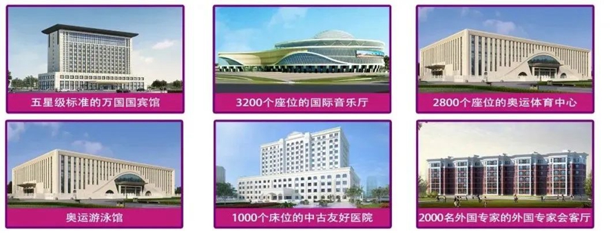 万国风情小镇围绕在河北外国语学院产教融合示范区周围,并且三面临街挨路,北望碧桂园社区,与侏罗纪恐龙公园比肩,毗邻河北医科大学第一医院,拥有五星级标准的万国国宾馆、3200个座位的国际音乐厅、2800个座位的奥运体育中心、奥运游泳馆、1000个床位的中古友好医院、2000名外国专家的外国专家公寓等,是高端配置的风情小镇,是加快建设现代化、国际化、美丽省会城市的重要建设项目。